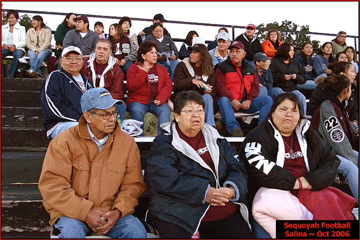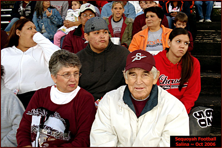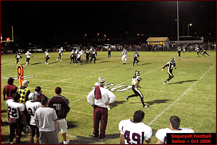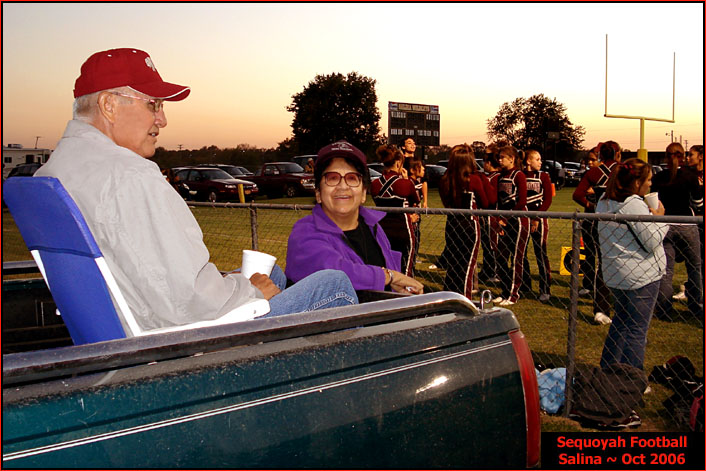 Had a bite to eat and headed to the Sequoyah-Salina football game in Salina. Arrived at the stadium; first person we met was Sequoyah teacher Don Franklin. We had a good visit and he gave us a tour of the Cherokee Nation bus the teams now use to travel to away games. It's a big highway cruiser just like those Greyhound buses we used to ride before we could afford a car of our own. It's got a stereo system that they use to listen to CD's and a DVD player and television screens located through-out the bus. Toured the stands before the game started, looking for alumni; found Chuck Deerinwater, Mixwater Buckskin, Forman Ross, Robert & Wauneta Sanders, Amon Baker, DeWayne Marshall and a few others. This the first game we've attended since we left Sequoyah in the 1960s. The uniforms have changed, but not much; the Cheerleaders are still cute and energetic. I don't remember our cheerleaders doing acrobatics like these girls. At last the kick-off. Dang! Fumbled on the first play but the Indians recovered. Next play . . . a 40 yard pass to the Wildcat's 40. Then a quarterback lateral to Travis Boswell, who raced the final 40 yards for the score. The Indians continued to play well and the score at the end of the first quarter: 28 - 0. As soon as the sun set, it got COLD! Fortunately the Indians scored early and often and we left at halftime with the score 56 - 0. |