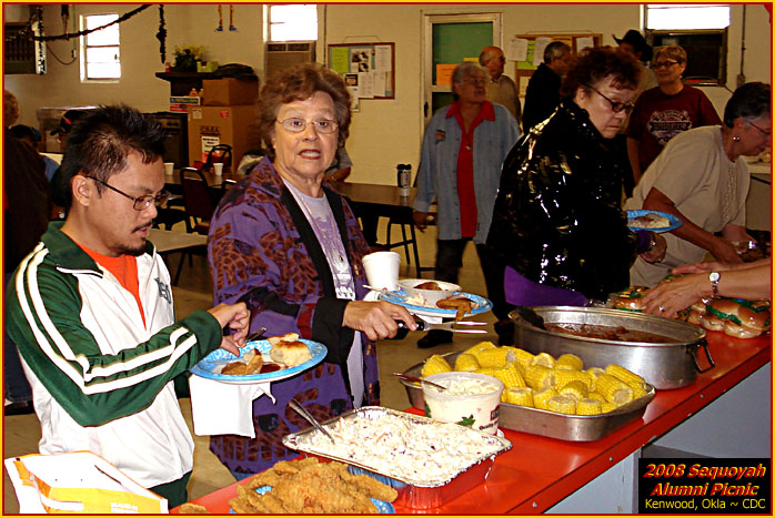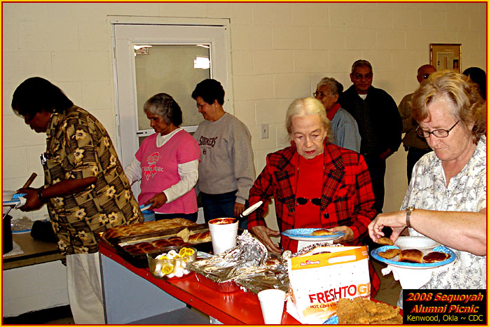 Folks started arriving around 10 in the morning; many carrying desserts like blackberry cobbler, cookies, cheesecake, fruit pies and other goodies. Seq. Alum. Assoc. secretary, Roberta Gibson brought roasted pork tenderloin with barbecue sauce, red beans and vegetables. Just thinking about it makes me hungry again. |